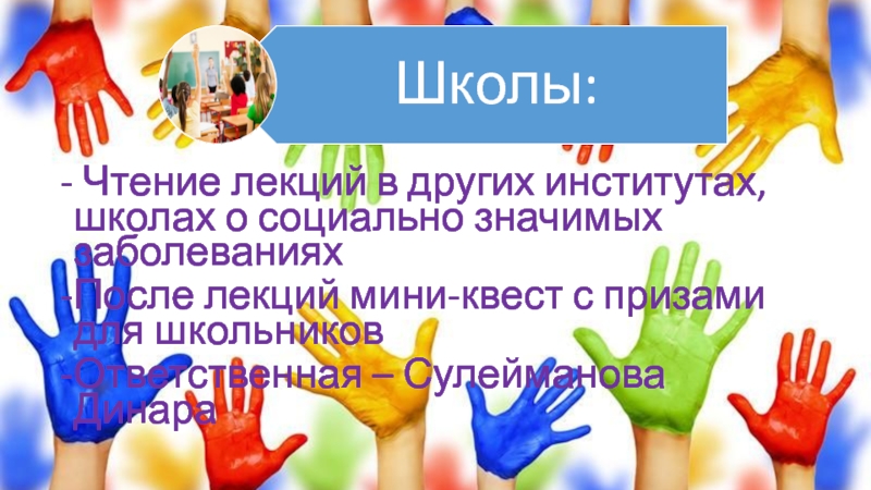 Чтение лекций в других институтах, школах о социально значимых заболеванияхПосле лекций мини-квест с призами для школьниковОтветственная