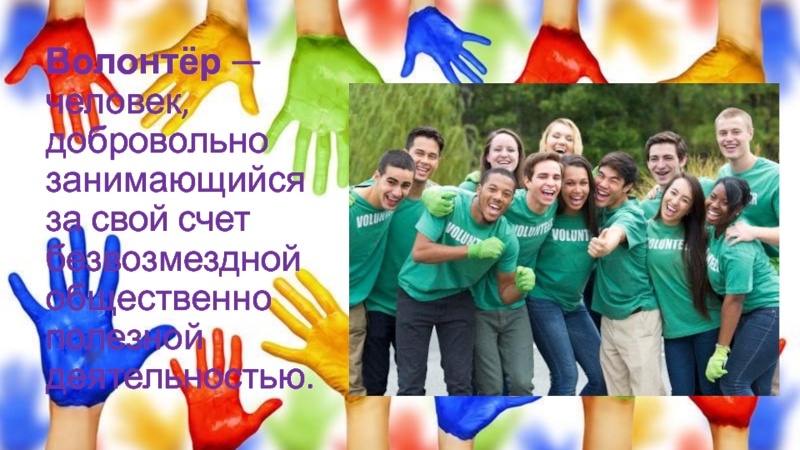 Слайд 2Волонтёр — человек, добровольно занимающийся за свой счет безвозмездной общественно полезной