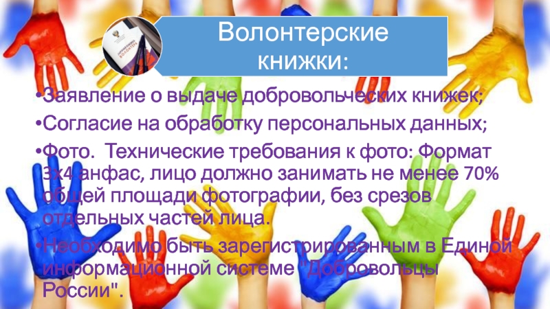 Заявление о выдаче добровольческих книжек;Согласие на обработку персональных данных;Фото.  Технические требования к фото: Формат 3х4 анфас, лицо