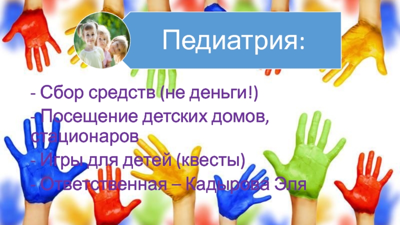- Сбор средств (не деньги!)- Посещение детских домов, стационаров- Игры для детей (квесты) - Ответственная – Кадырова
