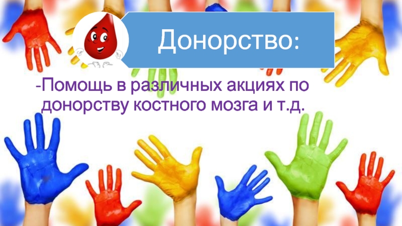 Слайд 6Помощь в различных акциях по донорству костного мозга и т.д.