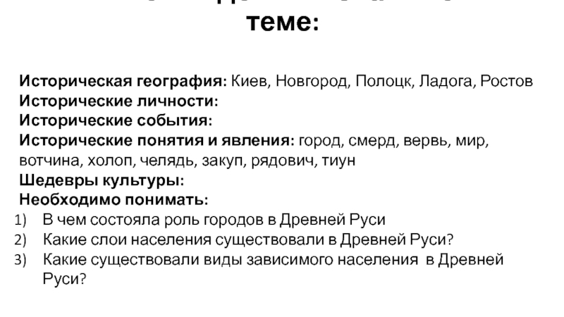 смерд, вервь, мир, вотчина, холоп, челядь, закуп, рядович, тиунШедевры культуры: