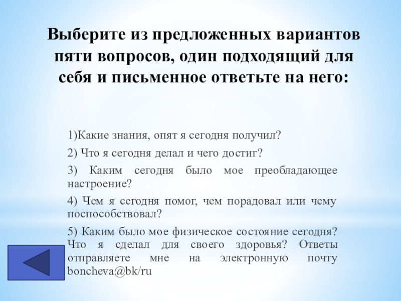 Если не удалось найти и скачать доклад-презентацию, Вы можете заказать его на нашем сайте. Мы постараемся найти нужный Вам материал и отправим по электронной почте. Не стесняйтесь обращаться к нам, если у вас возникли вопросы или пожелания:
