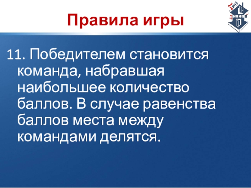 11. Победителем становится команда, набравшая наибольшее количество баллов. В