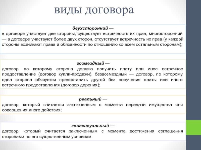 Сделки могут быть одно-, двух- или многосторонними. Всякий договор является сделкой, тогда как не всякая сделка — договором. Поэтому к договорам применяются правила об условиях действительности сделок, об основаниях признания их недействительными и наступающих в таких случаях последствиях, а также другие положения о сделках.