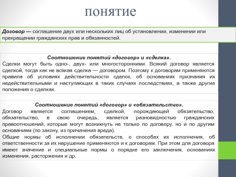 Договор является соглашением, сделкой, порождающей обязательство, обязательство, в свою очередь, является разновидностью гражданских правоотношений, которые могут возникнуть не только по договору, но и по другим основаниям (по закону, из причинения вреда).