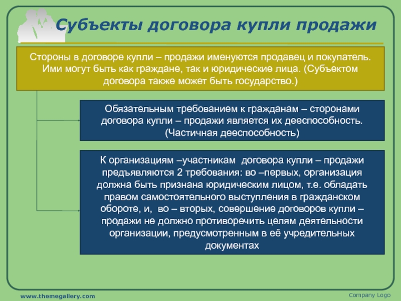 К организациям –участникам договора купли – продажи предъявляются 2 требования: во –первых, организация должна быть признана юридическим лицом, т.е. обладать правом самостоятельного выступления в гражданском обороте, и, во – вторых, совершение договоров купли – продажи не должно противоречить целям деятельности организации, предусмотренным в её учредительных документах