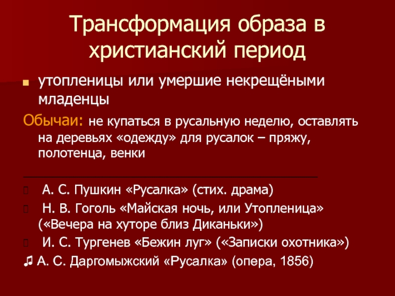 Трансформация образа в христианский периодутопленицы или умершие некрещёными младенцыОбычаи: не купаться в русальную неделю, оставлять на деревьях
