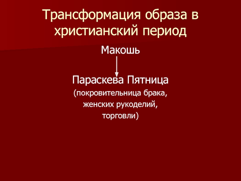 Трансформация образа в христианский периодМакошьПараскева Пятница(покровительница брака,женских рукоделий,торговли)
