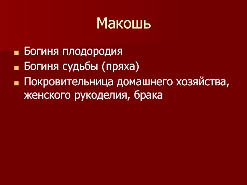 МакошьБогиня плодородияБогиня судьбы (пряха)Покровительница домашнего хозяйства, женского рукоделия, брака