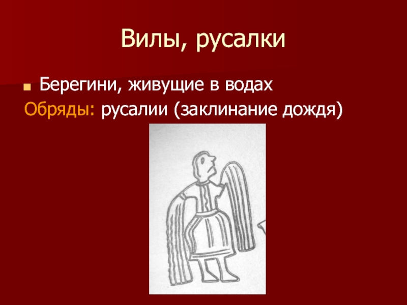 Вилы, русалкиБерегини, живущие в водахОбряды: русалии (заклинание дождя)