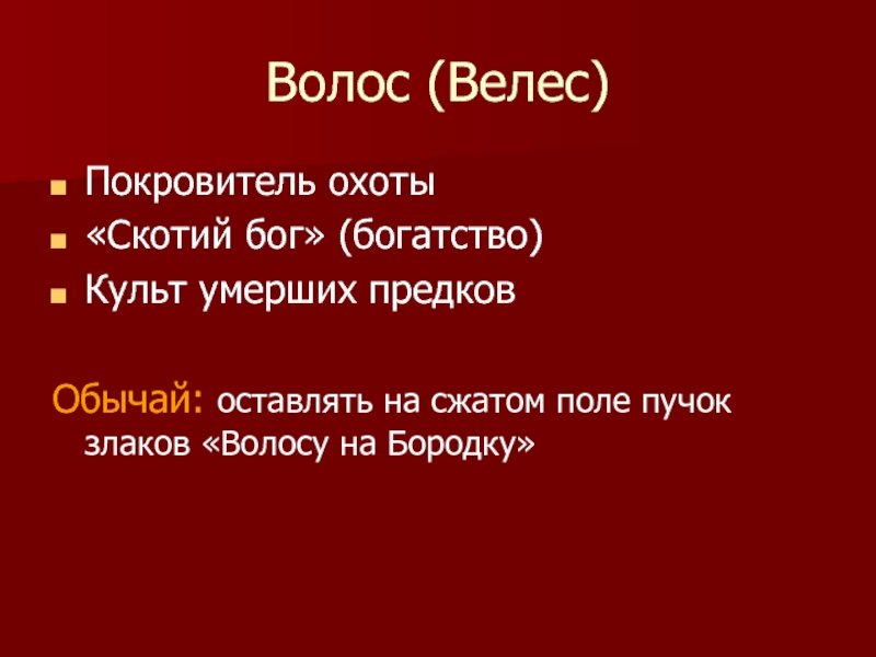 Волос (Велес)Покровитель охоты«Скотий бог» (богатство)Культ умерших предковОбычай: оставлять на сжатом поле пучок злаков «Волосу на Бородку»