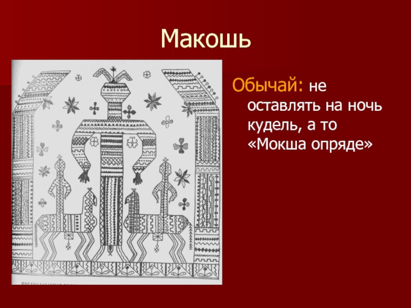МакошьОбычай: не оставлять на ночь кудель, а то «Мокша опряде»