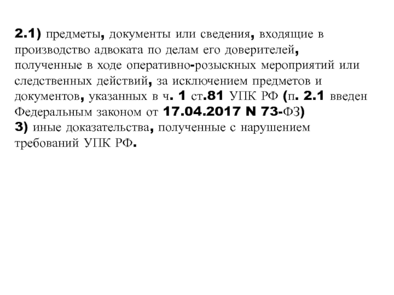Слайд 262.1) предметы, документы или сведения, входящие в производство адвоката по