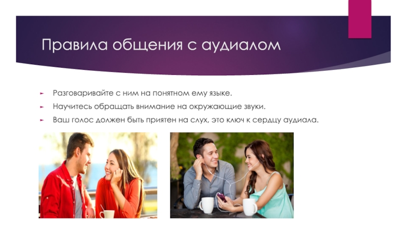 Правила общения с аудиалом Разговаривайте с ним на понятном ему языке.Научитесь обращать внимание на окружающие звуки.Ваш голос