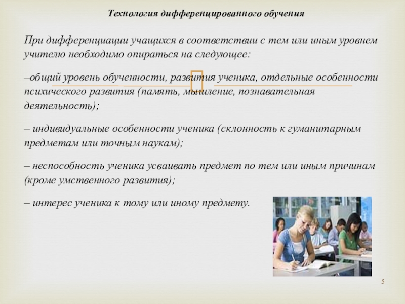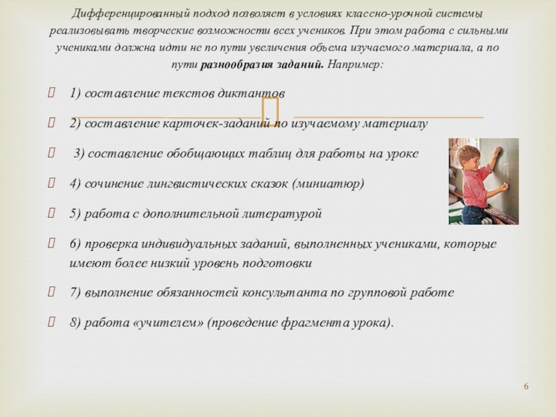 Дифференцированный подход позволяет в условиях классно-урочной системы реализовывать творческие возможности всех учеников. При этом работа с сильными учениками должна идти не по пути увеличения объема изучаемого материала, а по пути разнообразия заданий. Например:
