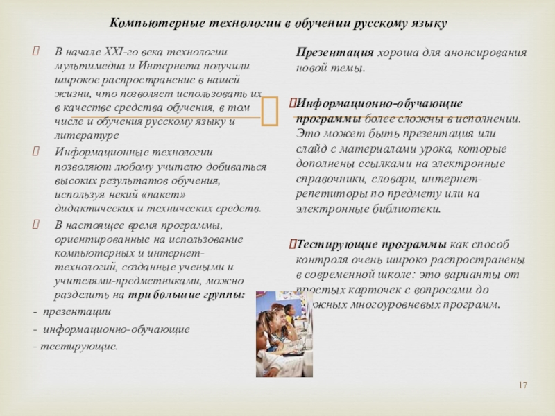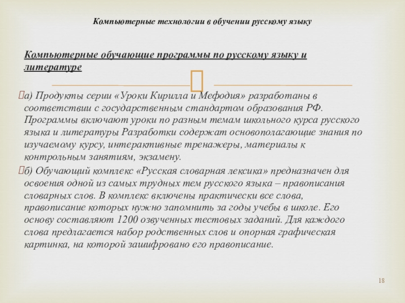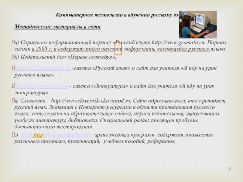 Информационно-обучающие программы более сложны в исполнении. Это может быть презентация или слайд с материалами урока, которые дополнены ссылками на электронные справочники, словари, интернет-репетиторы по предмету или на электронные библиотеки.