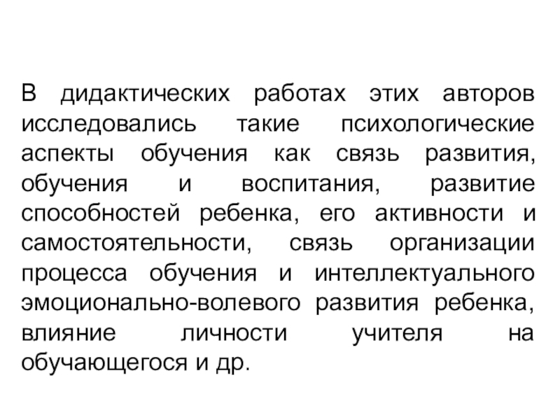 Слайд 8В дидактических работах этих авторов исследовались такие психологические аспекты обучения
