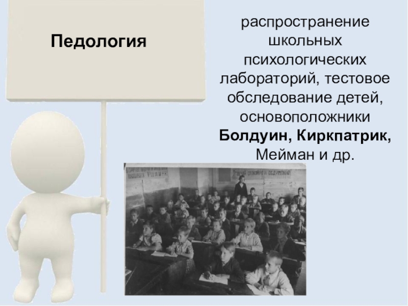 Слайд 14распространение школьных психологических лабораторий, тестовое обследование детей, основоположники Болдуин, Киркпатрик,