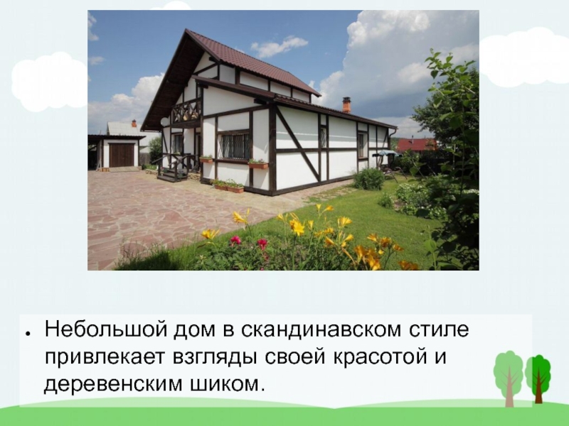 Слайд 3Небольшой дом в скандинавском стиле привлекает взгляды своей красотой и