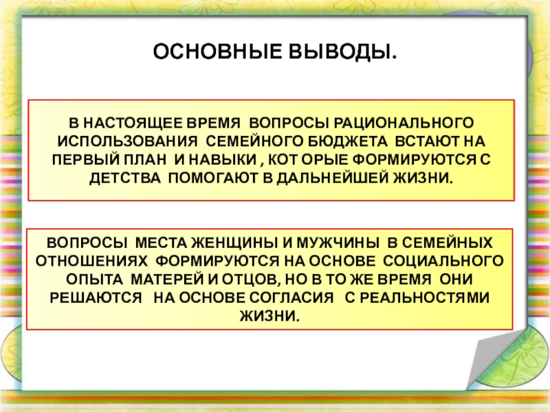 ВОПРОСЫ МЕСТА ЖЕНЩИНЫ И МУЖЧИНЫ В СЕМЕЙНЫХ ОТНОШЕНИЯХ ФОРМИРУЮТСЯ НА ОСНОВЕ СОЦИАЛЬНОГО ОПЫТА МАТЕРЕЙ И ОТЦОВ, НО В ТО ЖЕ ВРЕМЯ ОНИ РЕШАЮТСЯ НА ОСНОВЕ СОГЛАСИЯ С РЕАЛЬНОСТЯМИ ЖИЗНИ.