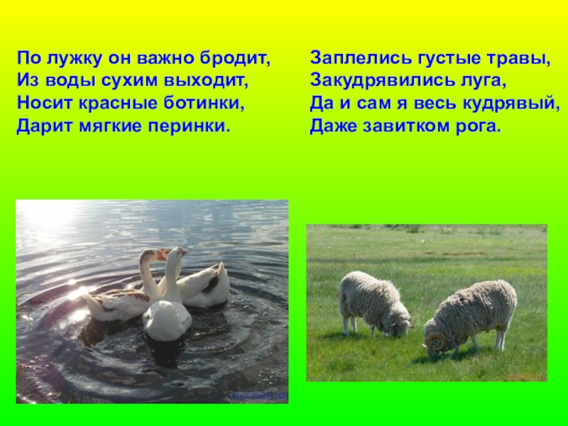 По лужку он важно бродит,Из воды сухим выходит,Носит красные ботинки,Дарит мягкие перинки.Заплелись густые травы,Закудрявились луга,Да и сам