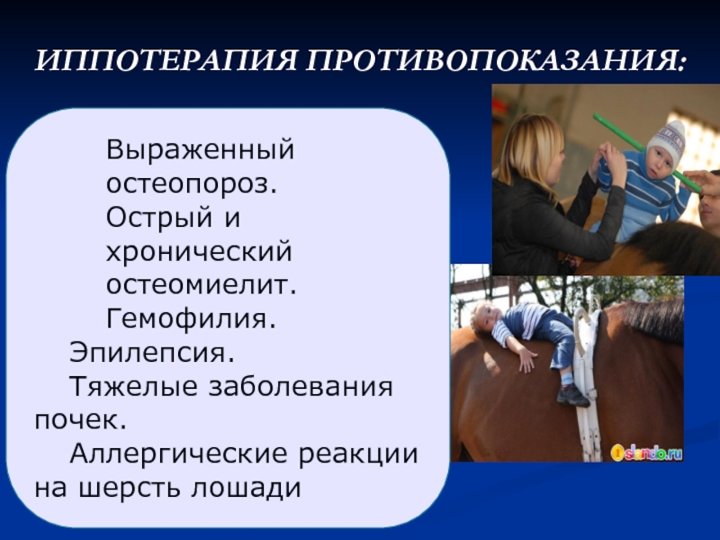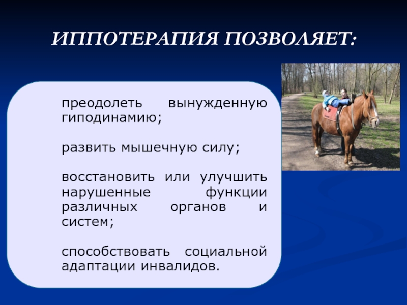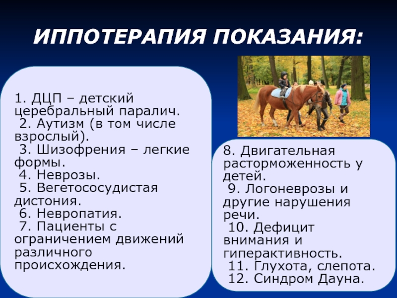 Иппотерапию используют при нарушениях опорно-двигательного аппарата, атеросклерозе, черепно-мозговых травмах, полиомиелите,