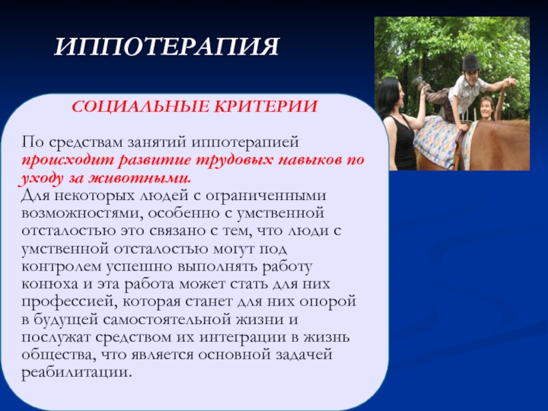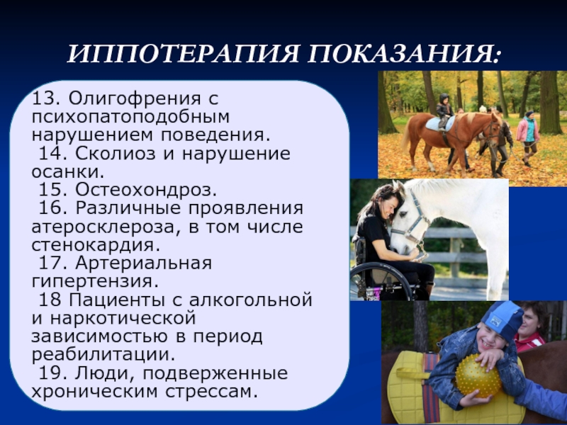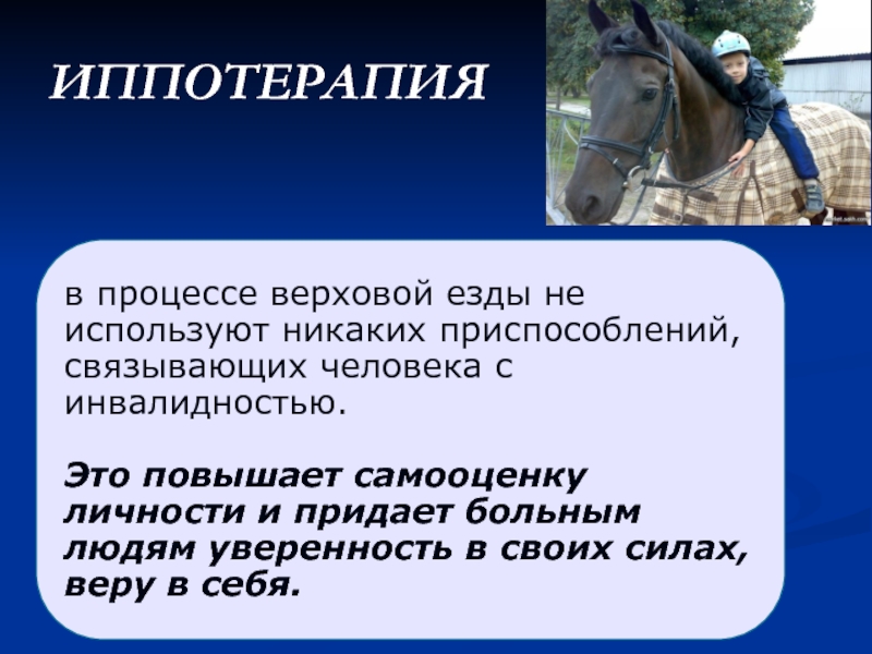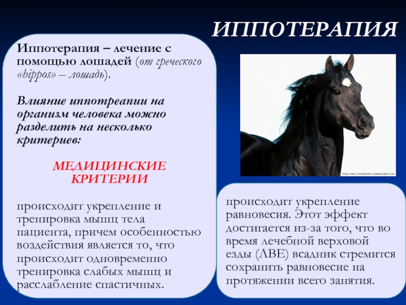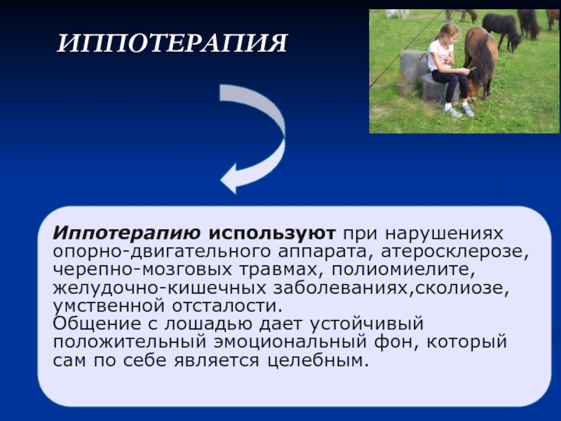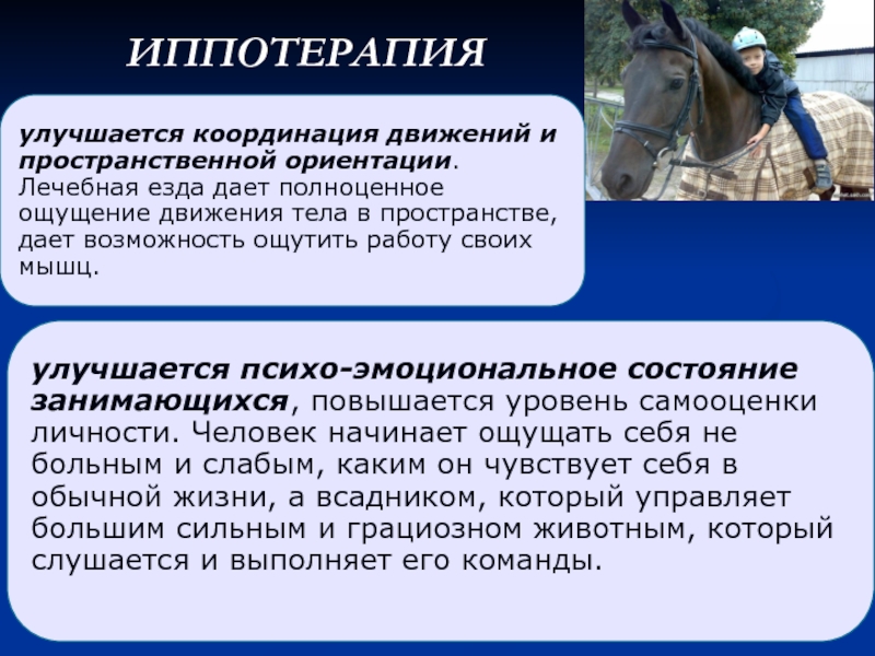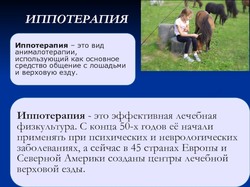 С конца 50-х годов её начали применять при психических и неврологических заболеваниях, а сейчас в 45 странах Европы и Северной Америки созданы центры лечебной верховой езды.