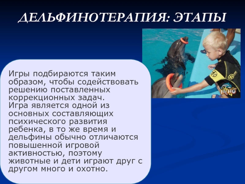 ребенка, в то же время и дельфины обычно отличаются повышенной игровой активностью, поэтому животные и дети играют друг с другом много и охотно.