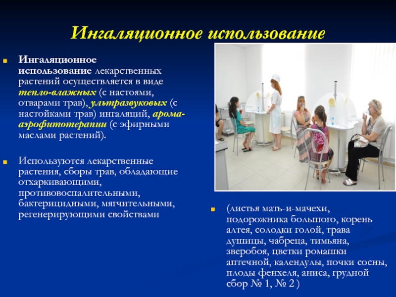 настоями, отварами трав), ультразвуковых (с настойками трав) ингаляций, арома-аэрофитотерапии (с