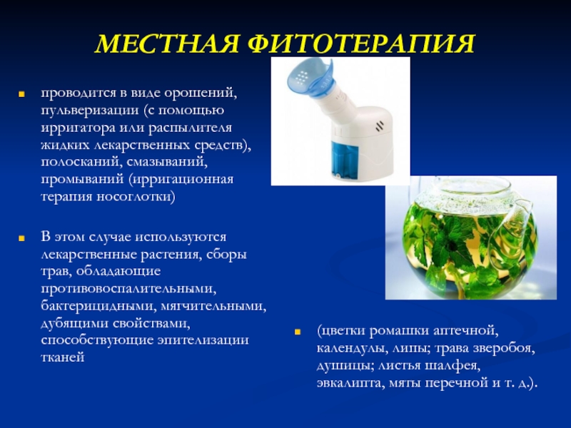 (местная фитотерапия) — орошения, пульверизация, промывания, полоскания, смазывания;