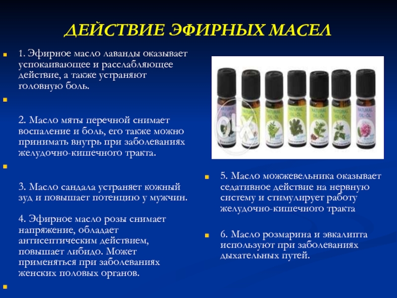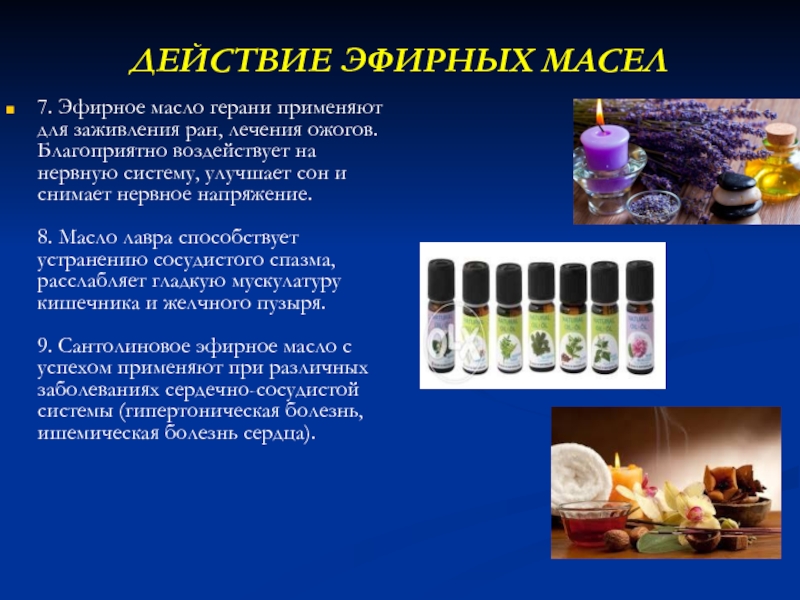 Слайд 47ДЕЙСТВИЕ ЭФИРНЫХ МАСЕЛ