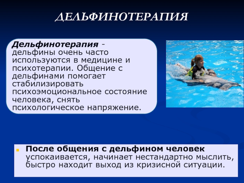 медицине и психотерапии. Общение с дельфинами помогает стабилизировать психоэмоциональное состояние человека, снять психологическое напряжение.