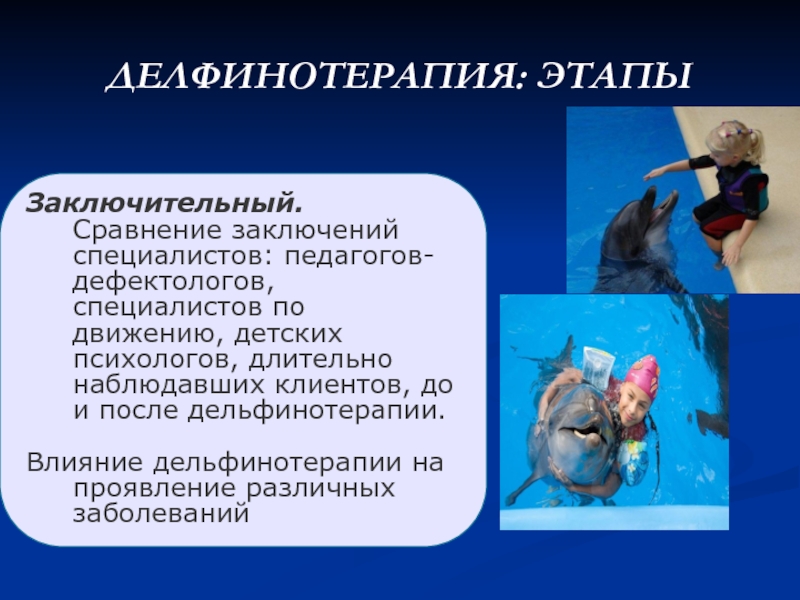 психологов, длительно наблюдавших клиентов, до и после дельфинотерапии.