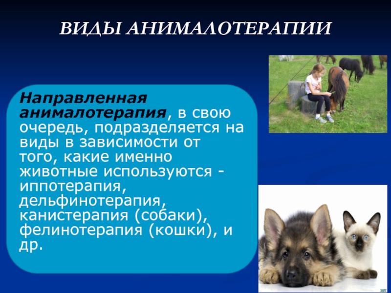 Направленная анималотерапия, в свою очередь, подразделяется на виды в
