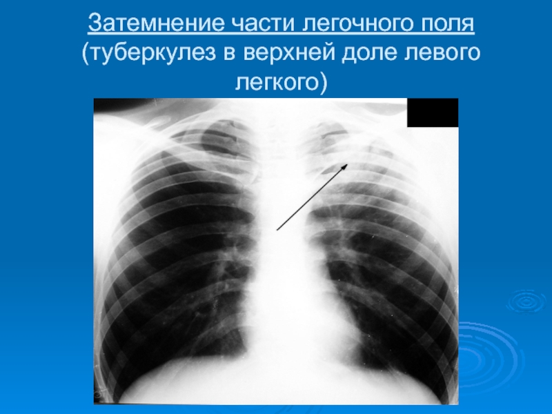 Слайд 35Затемнение части легочного поля (туберкулез в верхней доле левого легкого)
