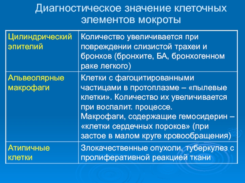 Слайд 15Диагностическое значение клеточных элементов мокроты