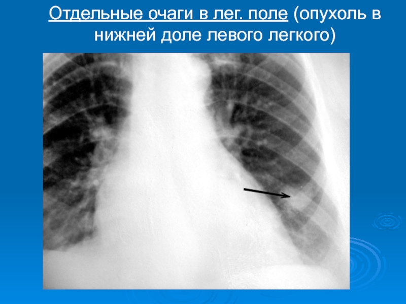 Слайд 41Отдельные очаги в лег. поле (опухоль в нижней доле левого