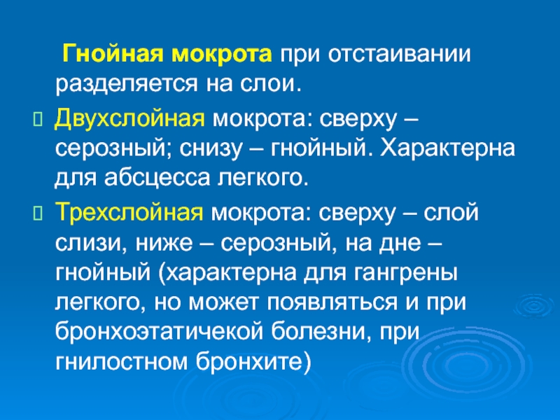 Слайд 8 Гнойная мокрота при отстаивании разделяется на слои.