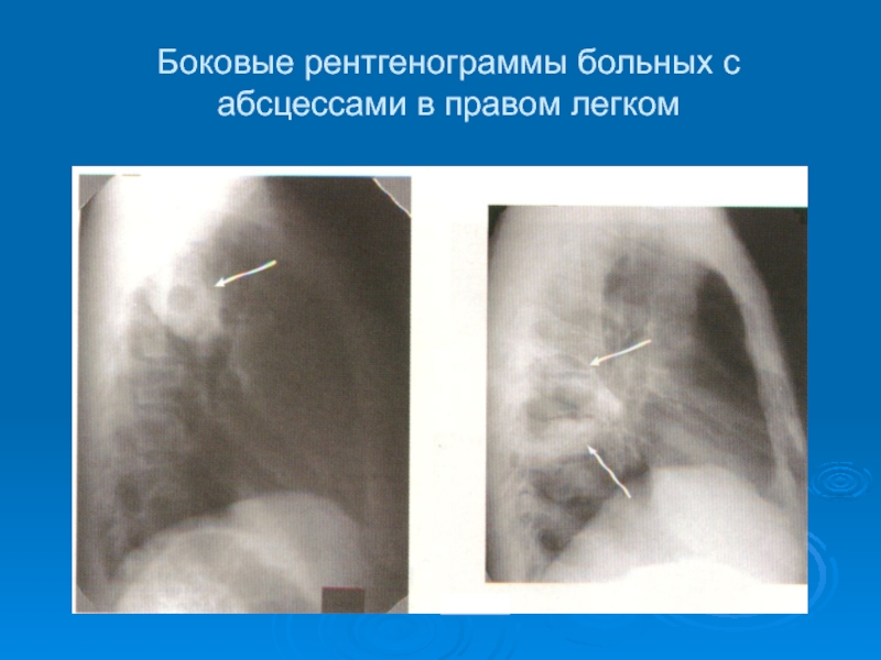 Слайд 45Боковые рентгенограммы больных с абсцессами в правом легком