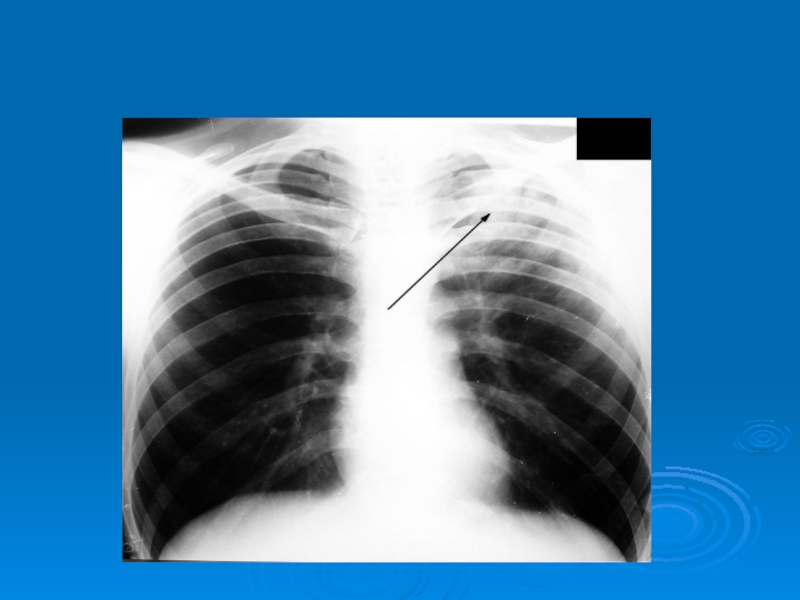 Слайд 35Затемнение части легочного поля (туберкулез в верхней доле левого легкого)
