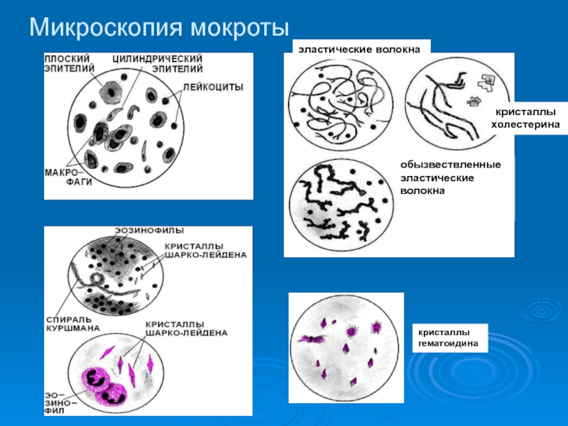 Эластические волокна – появляются в мокроте при деструкции легких (туберкулез, абсцесс, гангрена легкого, распадающийся рак легкого, др.)
