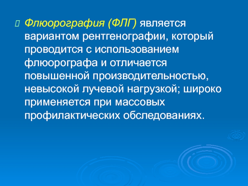 Слайд 30Флюорография (ФЛГ) является вариантом рентгенографии, который проводится с использованием флюорографа
