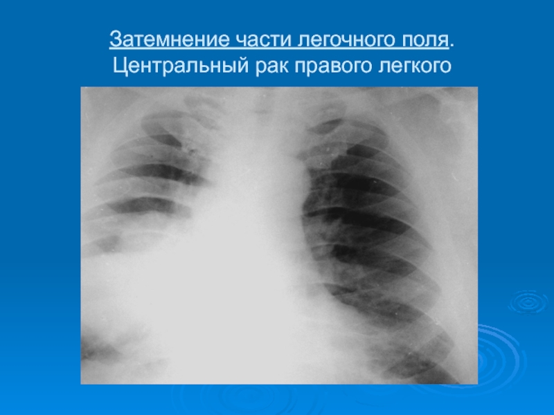 Слайд 33Затемнение части легочного поля. Центральный рак правого легкого