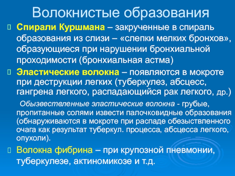Обызвествленные эластические волокна - грубые, пропитанные солями извести палочковидные образования (обнаруживаются в мокроте при распаде обезыствленного очага как результат туберкул. процесса, абсцесса легкого, опухоли).