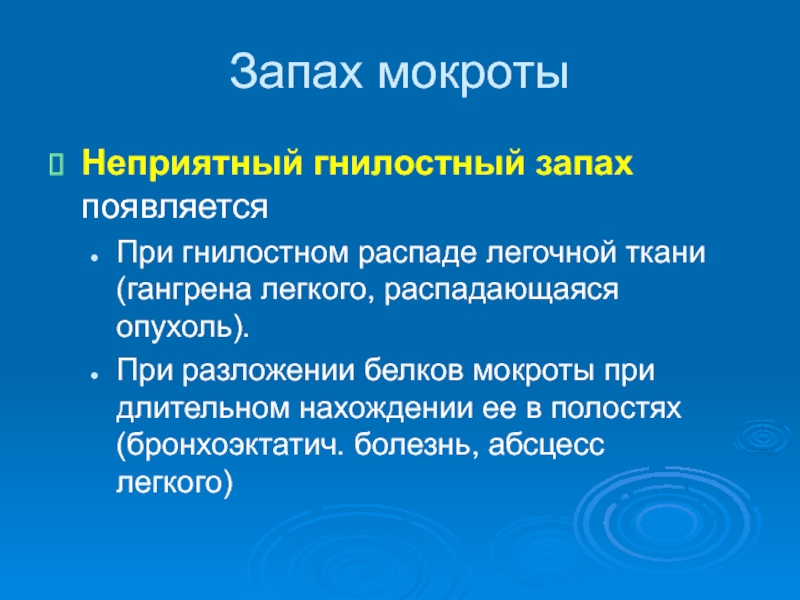 сверху – слой слизи, ниже – серозный, на дне – гнойный (характерна для гангрены легкого, но может появляться и при бронхоэтатичекой болезни, при гнилостном бронхите)