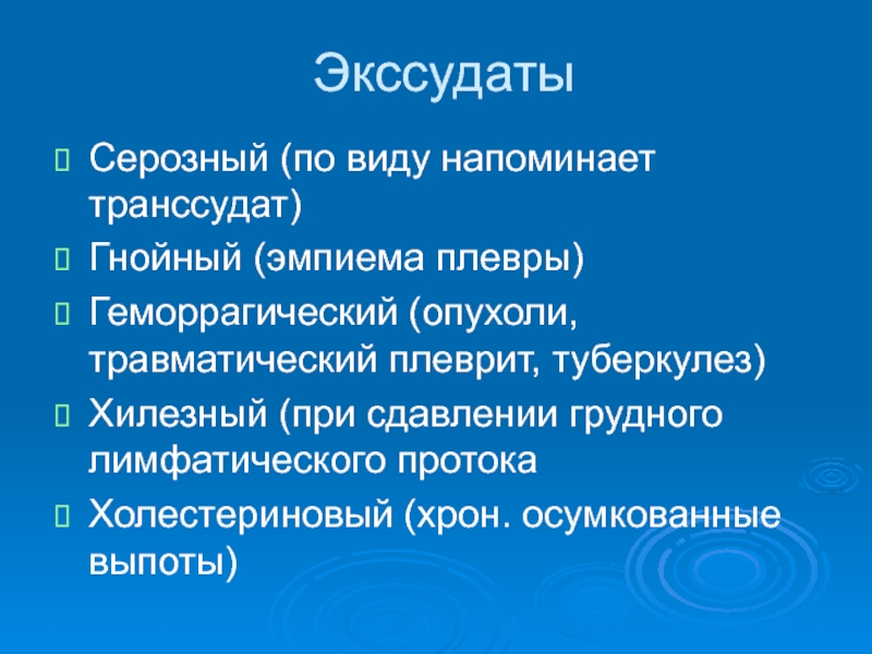 Серозная – жидкая, пенистая, бесцветная или с примесью крови (при застое крови в легких при левожелудочковой недостаточности)