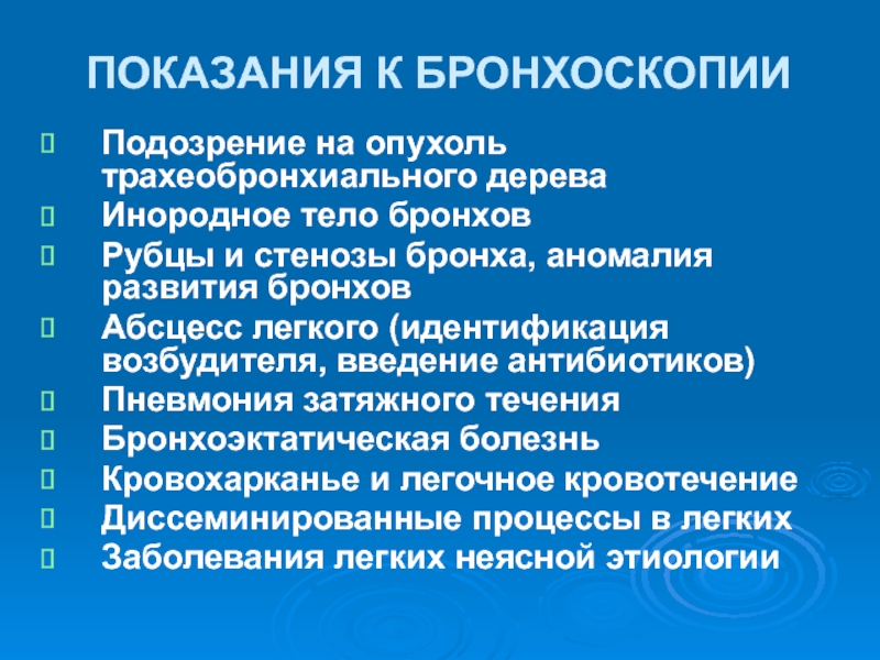Слайд 55ПОКАЗАНИЯ К БРОНХОСКОПИИ