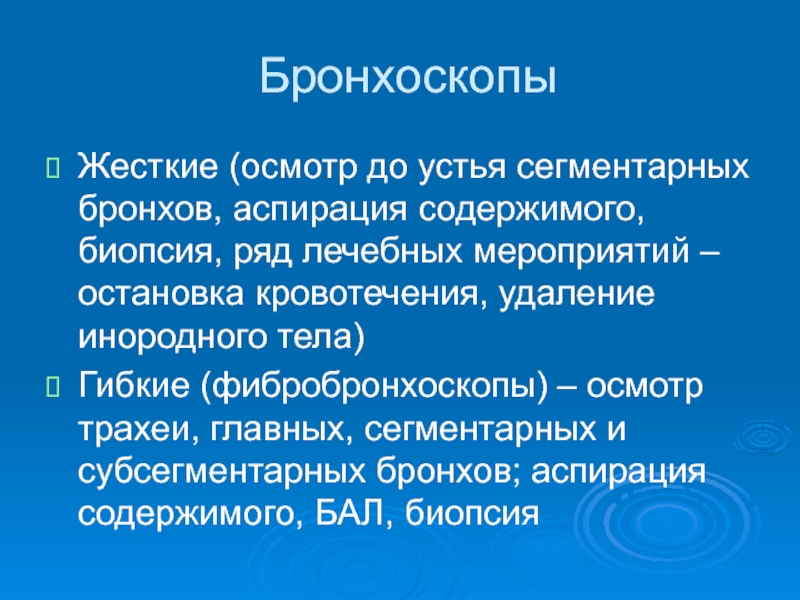 Жесткие (осмотр до устья сегментарных бронхов, аспирация содержимого, биопсия,
