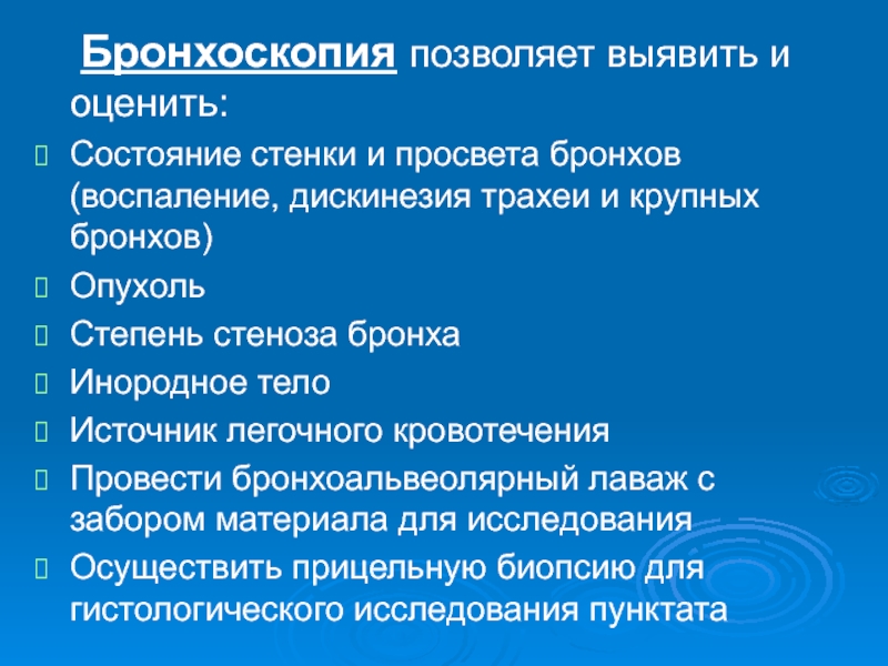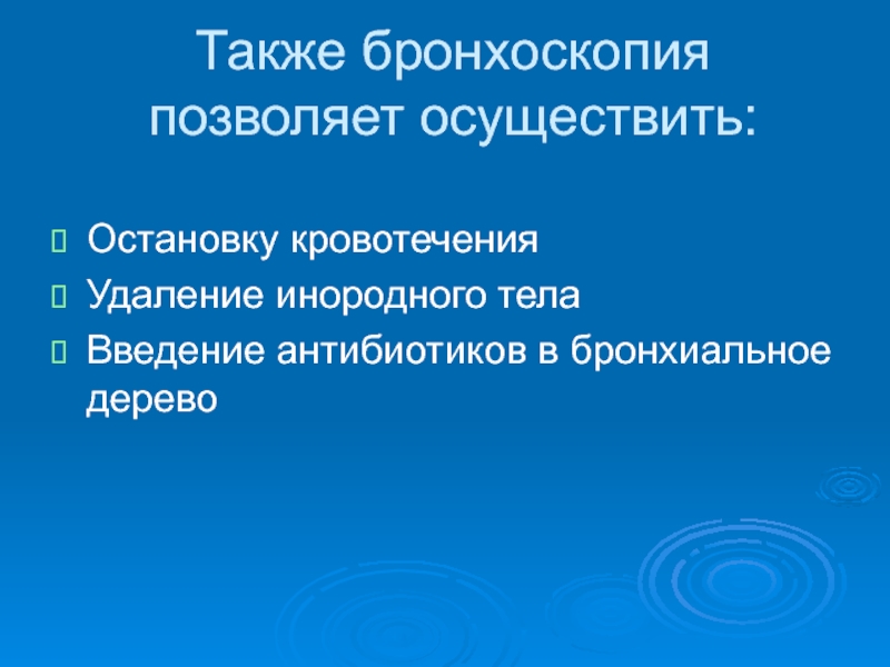 Слайд 57Также бронхоскопия позволяет осуществить: